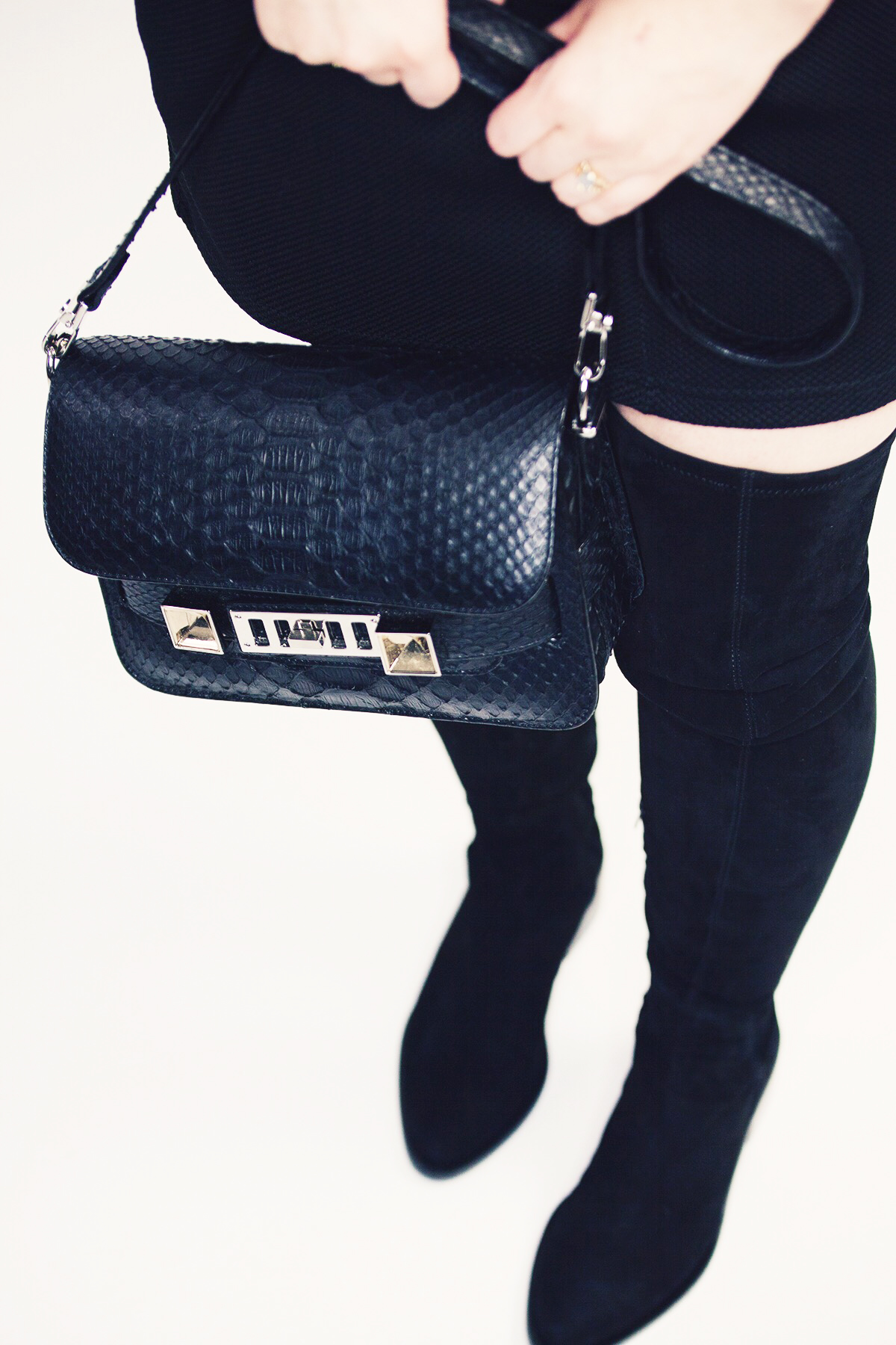// Overknee Boots – & other Stories / Mantel – Edited (im Sale!!) / Kleid mit Stehkragen – Edited / Tasche – Proenza Schouler / Perlenohrring – Nouvel Heritage //