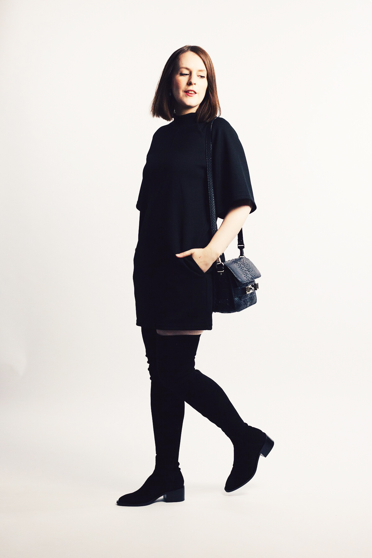 // Overknee Boots – & other Stories / Mantel – Edited (im Sale!!) / Kleid mit Stehkragen – Edited / Tasche – Proenza Schouler / Perlenohrring – Nouvel Heritage //