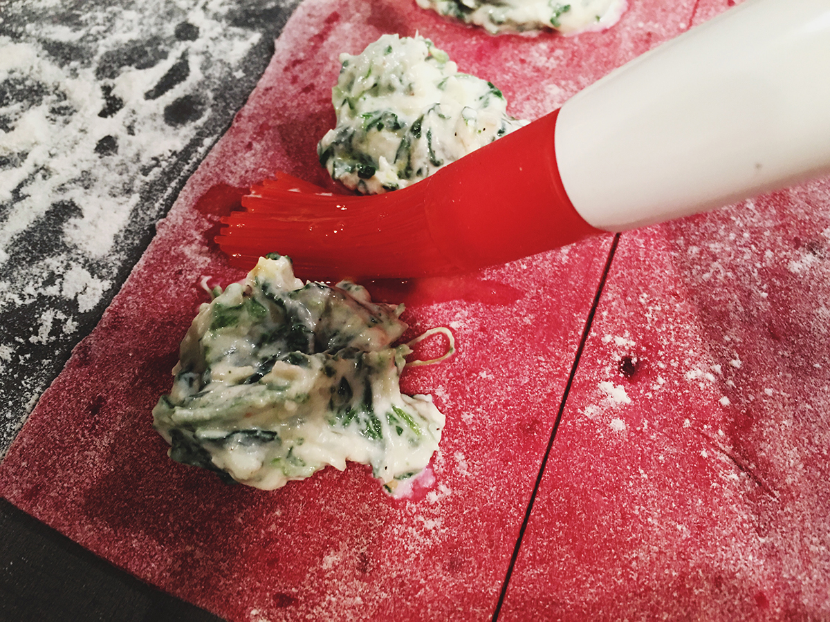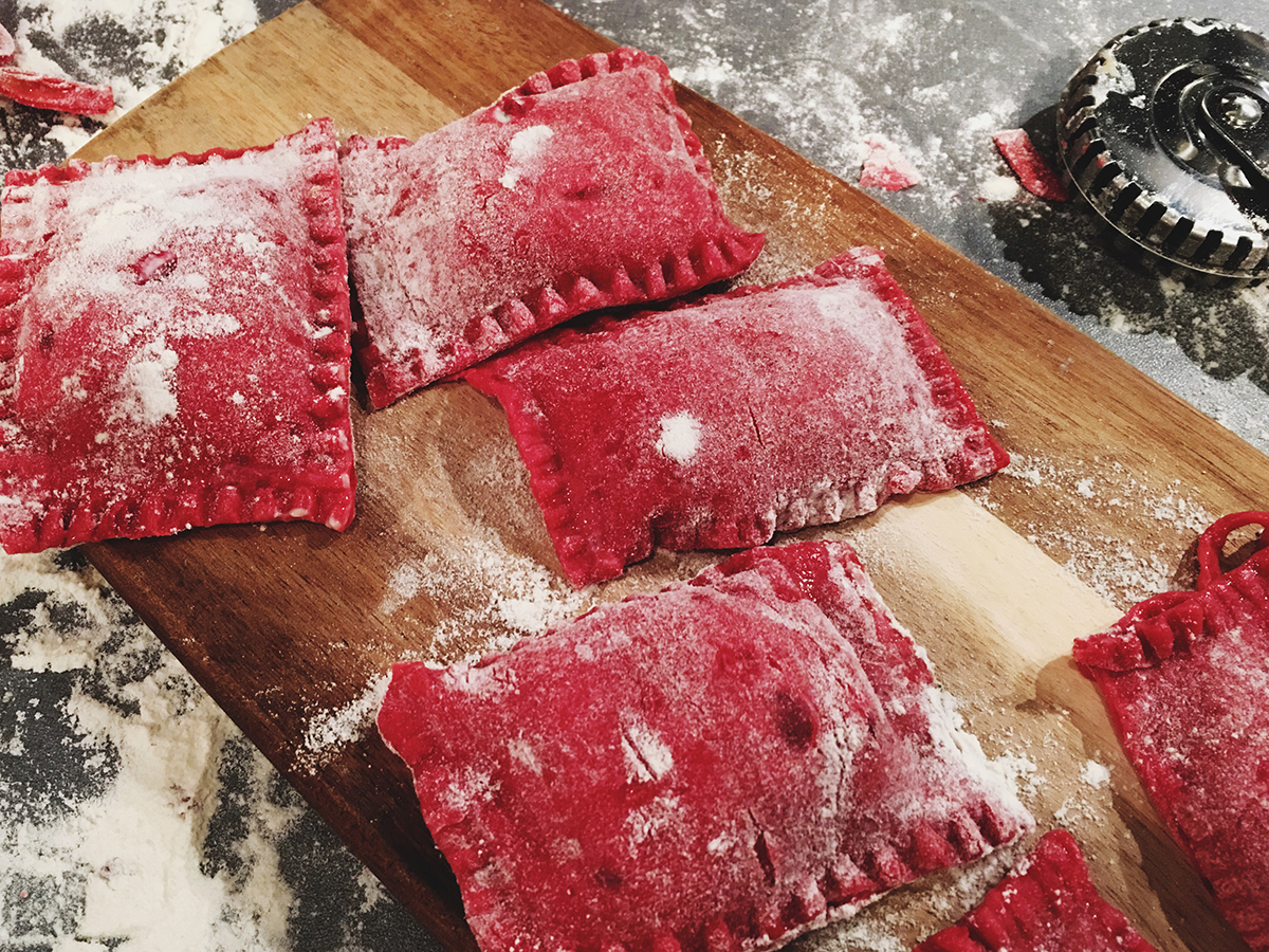 Ofen auf 200°C vorheizen. Rote Beete Knollen in Alufolie einwickeln und für etwa 1 Stunde im Ofen rösten (wenn ihr es eilig habt: nur so lange im Ofen garen, bis sie weich sind). Rote Beete abkühlen lassen, schälen und in den Mixer geben oder mit dem Pürierstab zu Mus verarbeiten. Das Rotebeetemus mit den Eiern, Mehl und Salz vermengen und gut verkneten. Mehr Mehl hinzugeben, sollte der Teig zu klebrig sein. Teig mit einem Tuch bedecken und für 30 Minuten ruhen lassen.