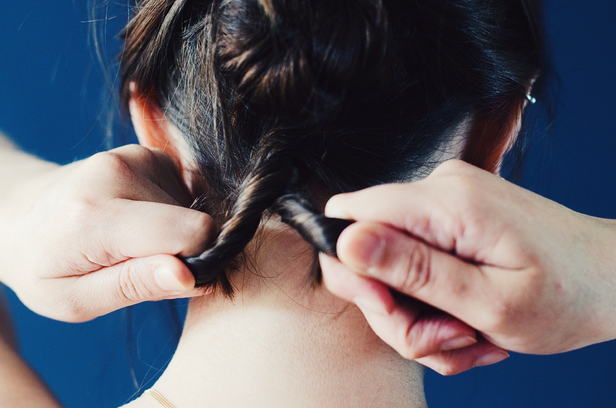 Sprüht etwas Texturspray ins Haar und knetet es ein. Zusätzlich verbessern leichte Wellen mit dem Haarglätter die Griffigkeit der Haare. Das Haar wird insgesamt waagerecht in drei Partien aufgeteilt. Ihr startet mit den Haaren am Oberkopf, wie beim Halfsie und teilt euch ein Zöpfchen ab. Dieses Zöpfchen halbiert ihr. Die zwei so entstandenen Partien werden nun ineinander gedreht. Mit einem Kamm oder einer Bürste schiebt ihr den entstandenen eingedrehten Zopf zusammen, schlagt ihn nach unten um und steckt die Enden am Kopf fest. Dies macht ihr nun mit den zwei weiteren waagerechten Haarpartien. Zupft euch gerne hier und da ein paar Strähnen heraus.