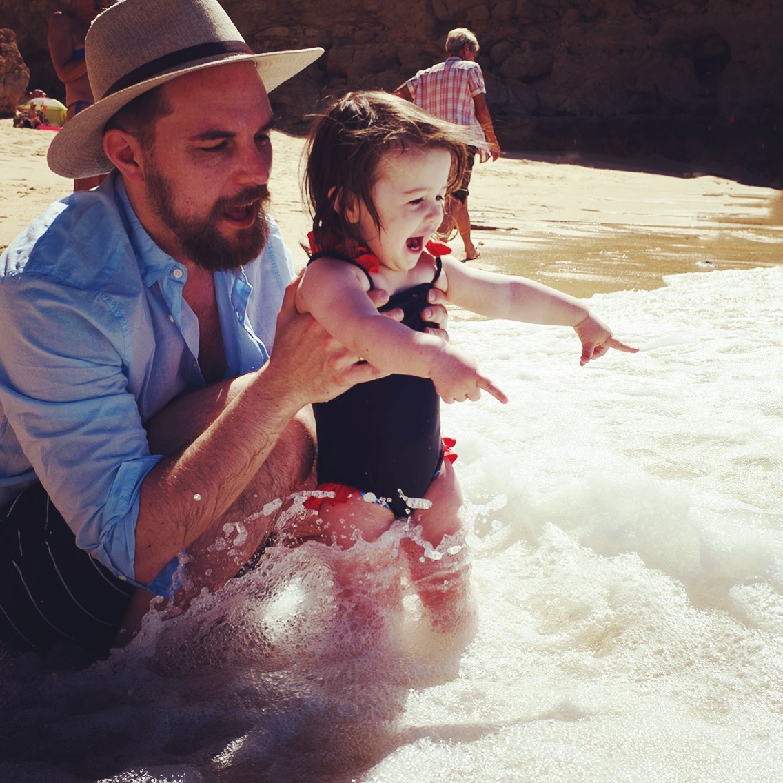 Emma ist ganz getreu ihres Sternzeichens eine absolute Wasserratte. Baden in der Wanne? Am liebsten täglich! Und im Urlaub muss ein Pool her, aber besser noch das Meer und dann muss auch sofort reingelaufen werden. Bei so viel Liebe zum Wasser und mindestens genauso viel Energie kommt man als erwachsener Sonnenanbeter, der eigentlich den Bauch entspannt in Richtung Sonne richten möchte, kaum hinterher. Ich erinnere mich noch an den Portugal Urlaub letztes Jahr (siehe Foto oben), in dem das Tochterkind ihre große Liebe fürs Meer entdeckte und wir große Mühen hatten, sie zwischendurch zum Aufwärmen am Strand zu beschäftigen. Pause? Nix da, direkt wieder ins Wasser und mit den Wellen spielen.