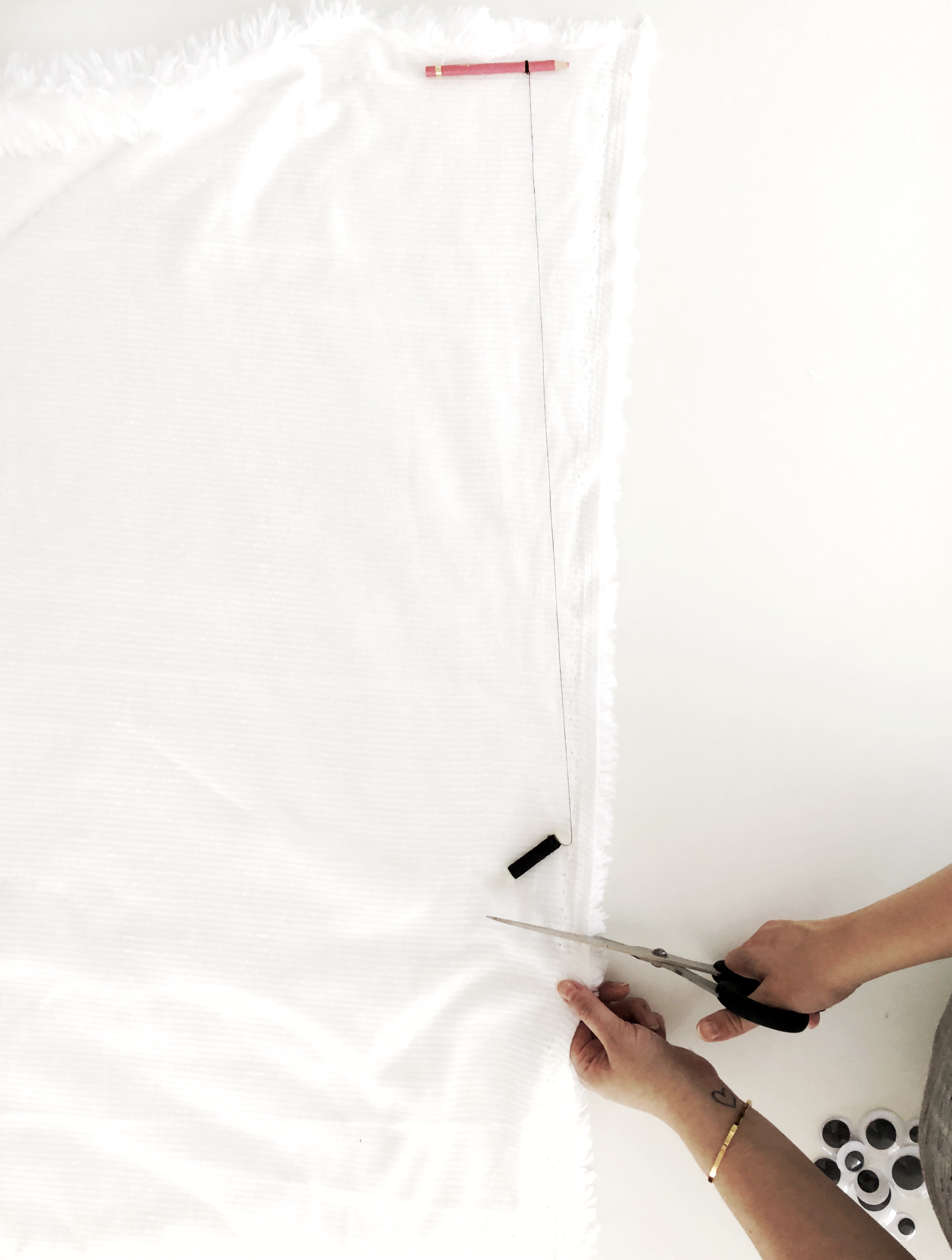 Der Körper. Dafür wird der Schultütenrohling mit Fell einschlagen. Um den aufgeklappten Kegel einfach auf den Stoff zu übertragen, habe ich einen Faden in der Länge des Kegels an den Stoffmalstift gebunden und so den Viertelkreis auf den Stoff gezogen. Ausschneiden und mit der Heißklebepistole an den Rohling geklebt. Wer eher der Mathevollprofi sein will, kann hier die Maße berechnen.