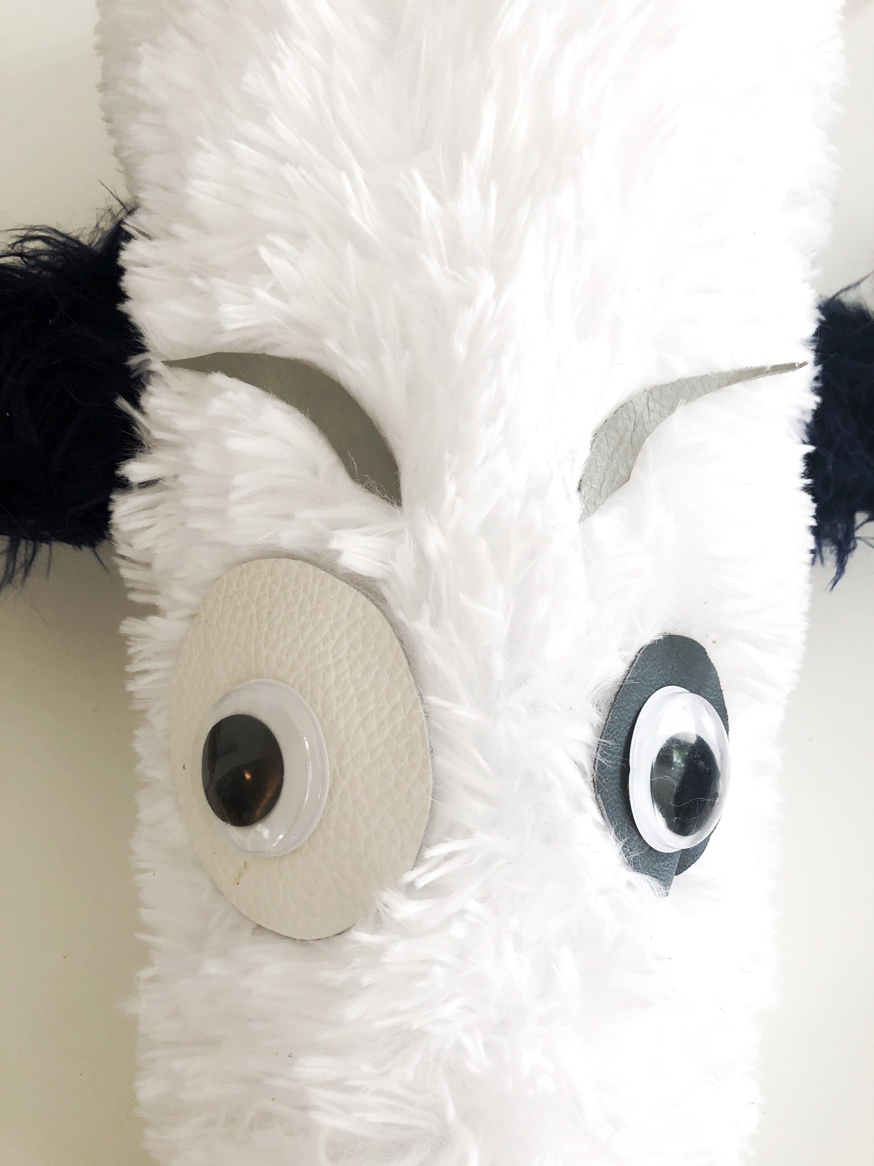 Die Augen. Ich entschied mich für die einfache Variante und besorgte große Wackelaugen. Man kann natürlich auch aus Filz Augen ausschneiden und zusammenkleben oder mit Styroporkugeln Glubschaugen basteln oder aus Pappmache Augen formen. Ihr seid da völlig frei und könnt euren wilden Kerl so gruselig oder lieb gestalten, wie ihr mögt. Ich habe beide Augen noch mit unterschiedlich farbigem leder hinterlegt, um die Augen noch ein wenig hervorzuheben und gleichzeitig das Wilde in dem wilden Kerl heraus zu kitzeln :)