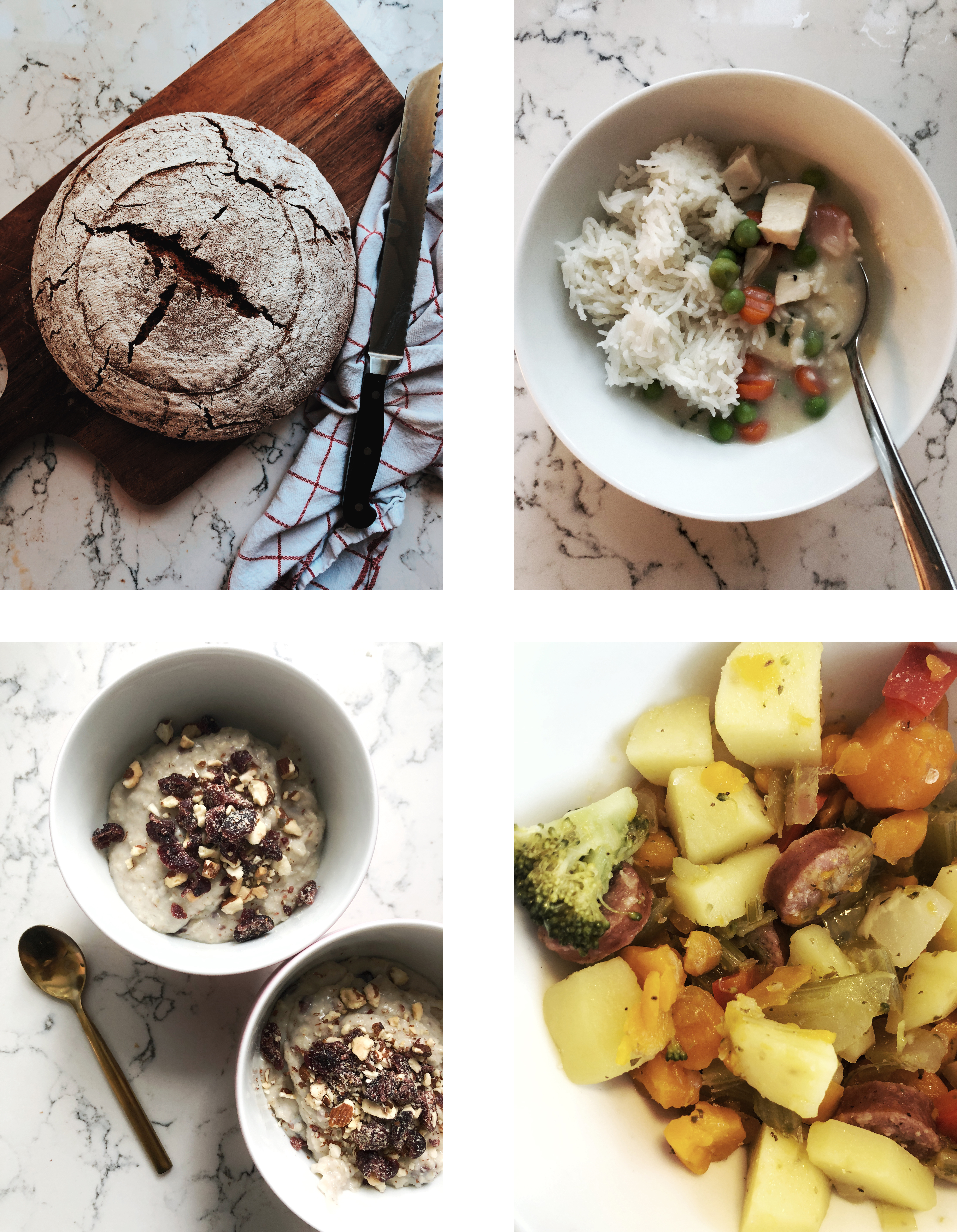 von oben links nach unten rechts: Ein Roggen-Dinkel-Sauerteig Brot (mit ganzen Dinkelkörnern! Noms!) / Hühnerfrikassee (nur mit weißem Fleisch und vielen Möhrchen und Erbsen!) / Mandel-Cranberry Porridge zum Frühstück / Den „Eintopf für Hungrige“ mit Kartoffeln, Sellerie, Möhren und Mettenden.
