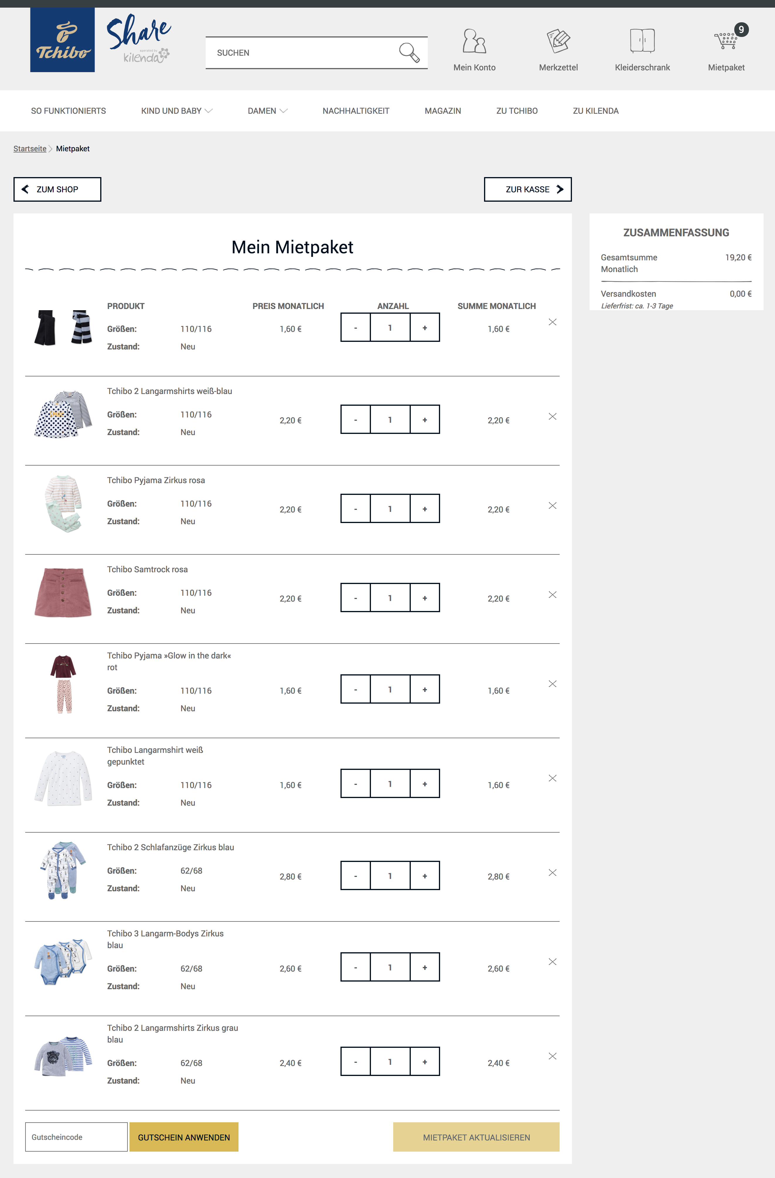 Kleidung für Kinder, die schnell aus ihren Kleidern herauswachsen oder nur für kurze saisonale Abschnitte benötigt werden, sowie Mode für Schwangere und Mütter (zB. für die Zeit nach der Geburt) oder auch Spielzeug können auf Tchibo Share einfach gemietet werden, statt sie teuer zu kaufen und am Ende selbst dafür sorgen zu müssen, dass sie zB auf Flohmärkten weiterverkauft oder dass im Bekanntenkreis neue Abnehmer gefunden werden. Es spart also nicht nur Zeit, sondern auch Platz im Kleiderschrank, wenn die Klamotten bei Nichtgebrauch direkt aussortiert und zurückgeschickt werden können.