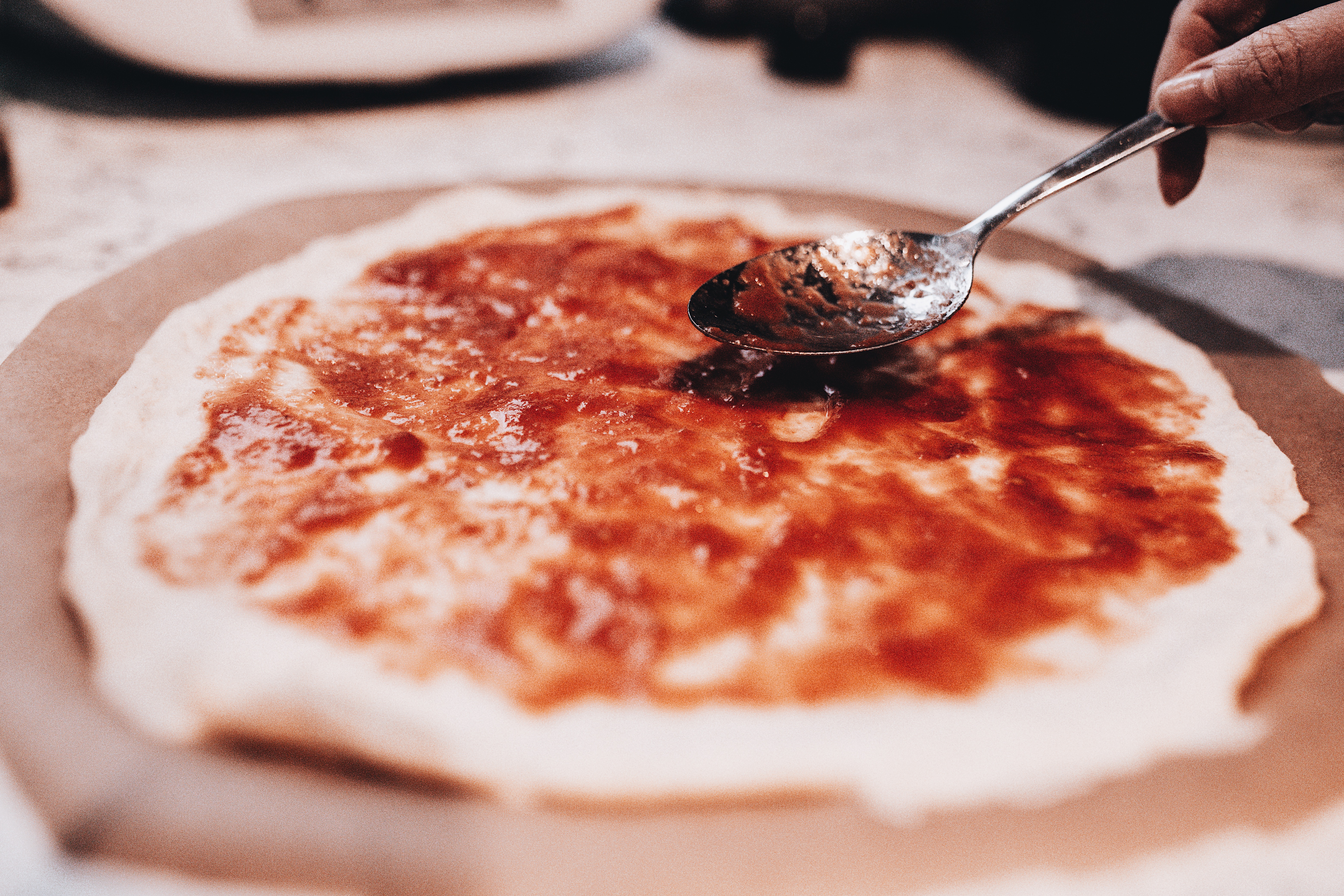 - Löffelt nun die Pizzasauce drauf. Vorsichtig: Nicht zu viel, sonst wird die Pizza arg matschig (wenn ihr das so wollt – ok! Experimentiert da mal herum). Ihr habt später, nach Ablauf der ersten 4 Minuten Backzeit noch die Chance, nachzulegen, sollte die Sauce zu stark eingebacken sein. Denkt an den obligatorischen Pizzarand, an den keine Sauce kommt.